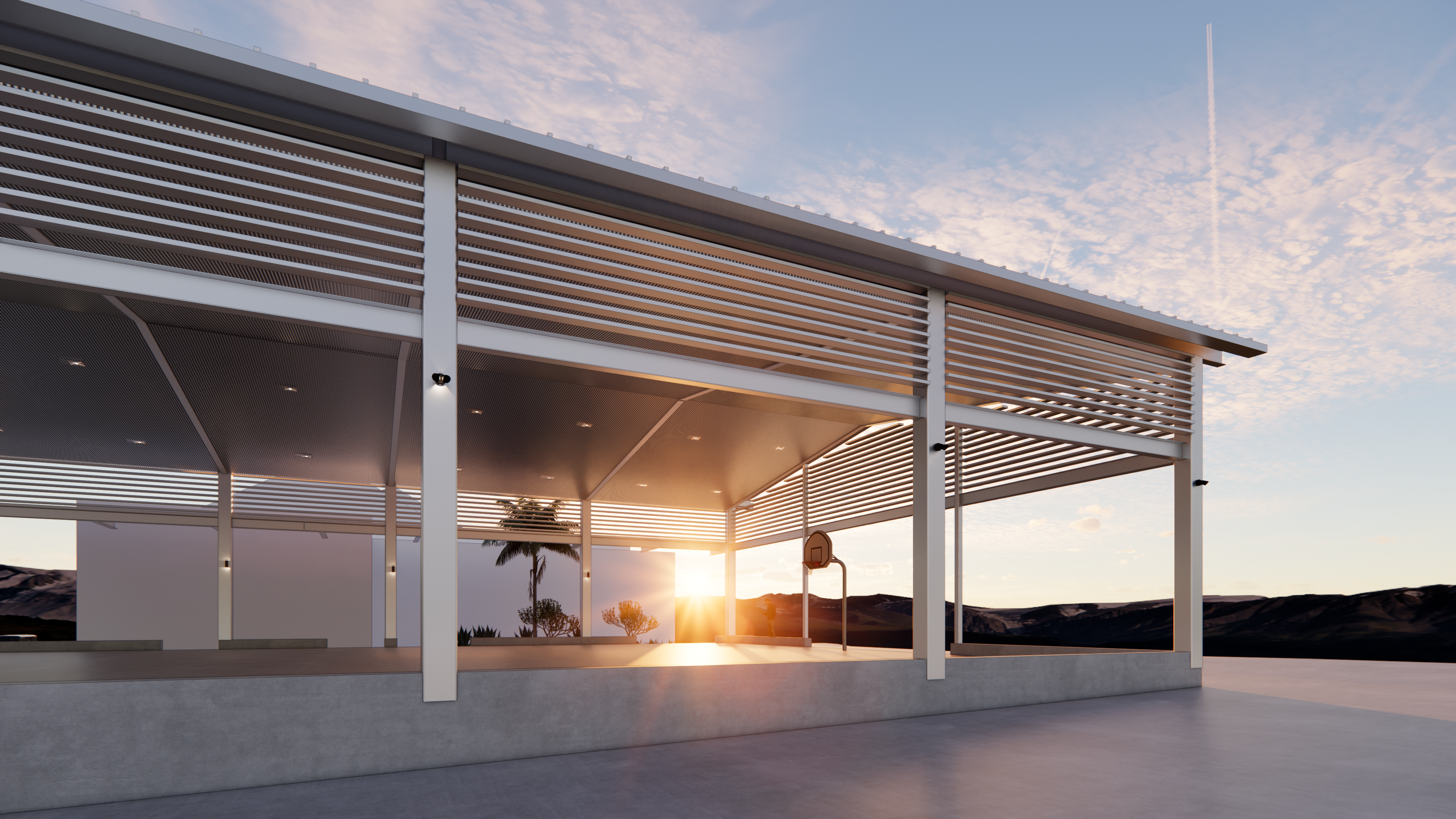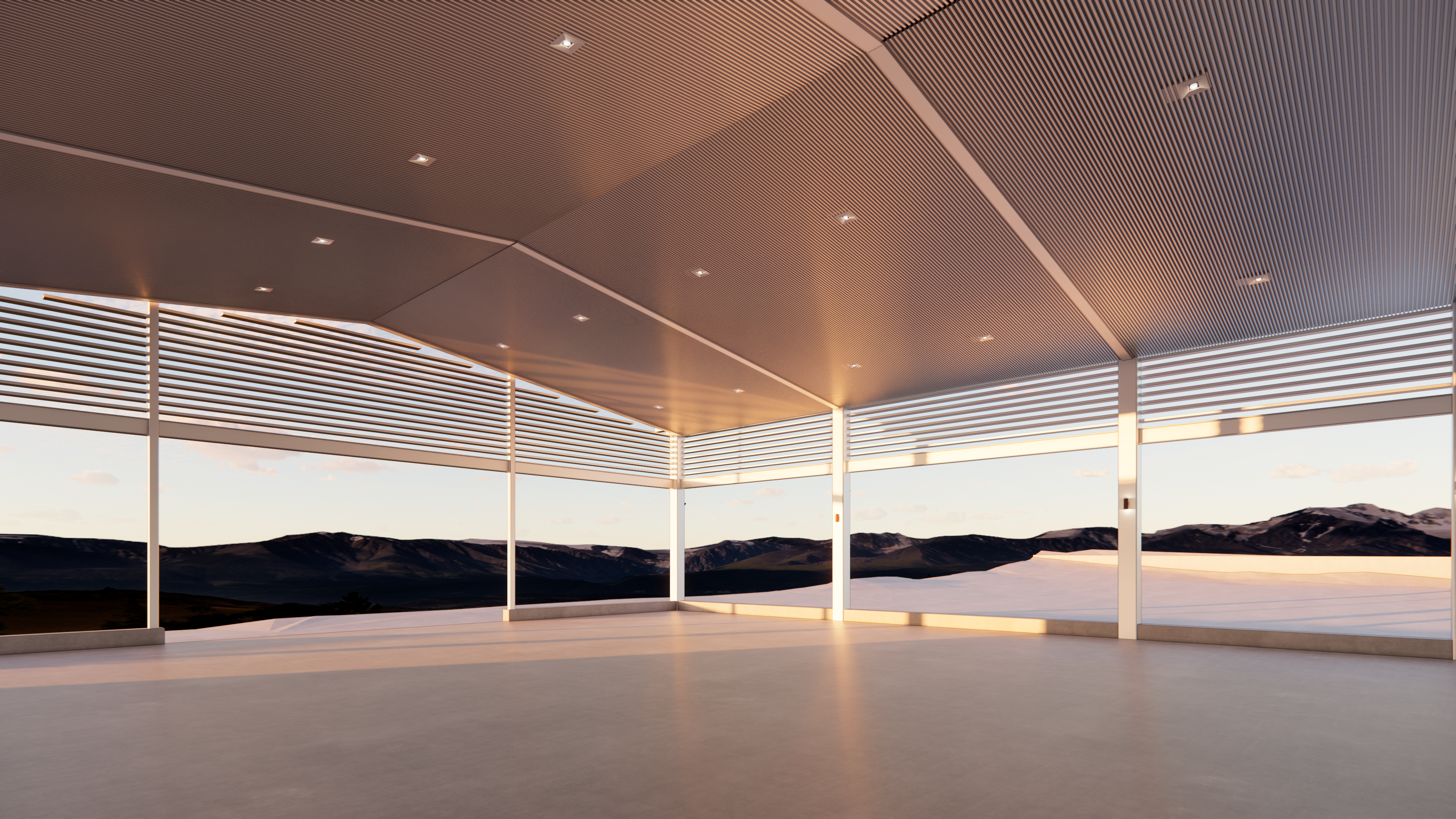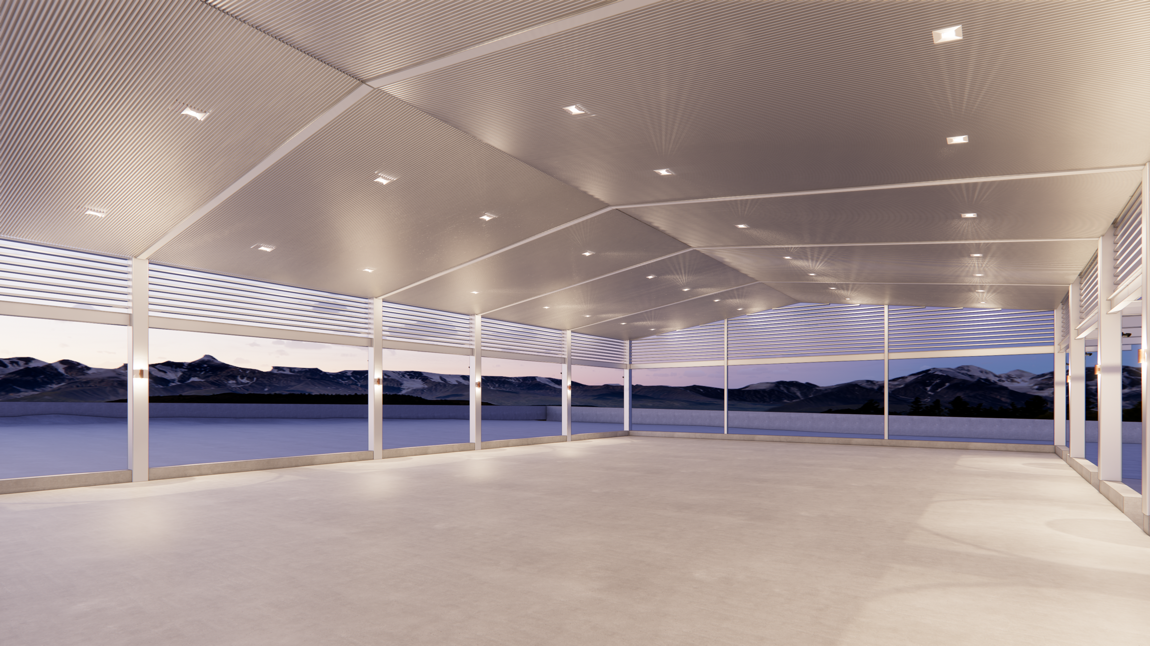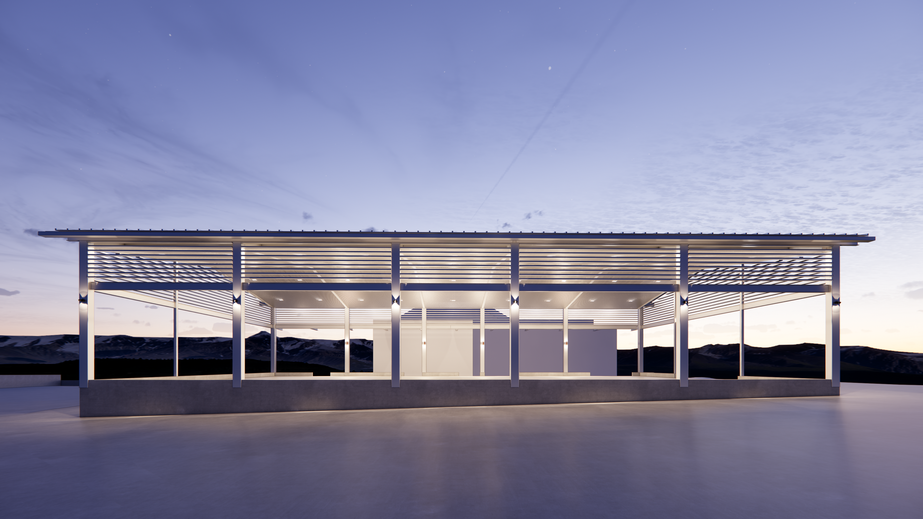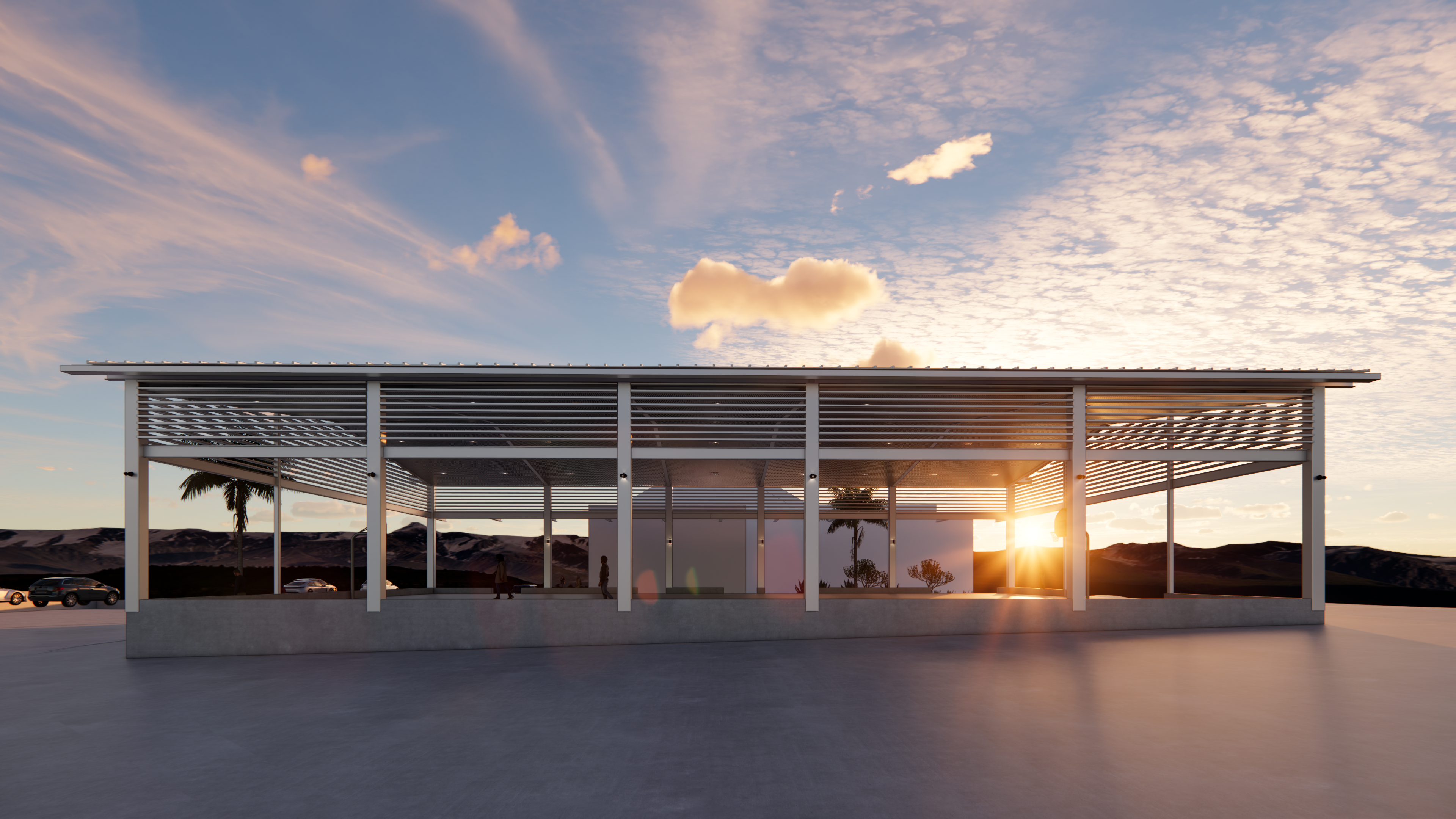 A 65’ x 100’ open air, contemplative metal tent, and gathering space, for Yorba Linda. CA. The structure featuring operable, metal clerestory louvers, interior and exterior lighting, and covered parking.