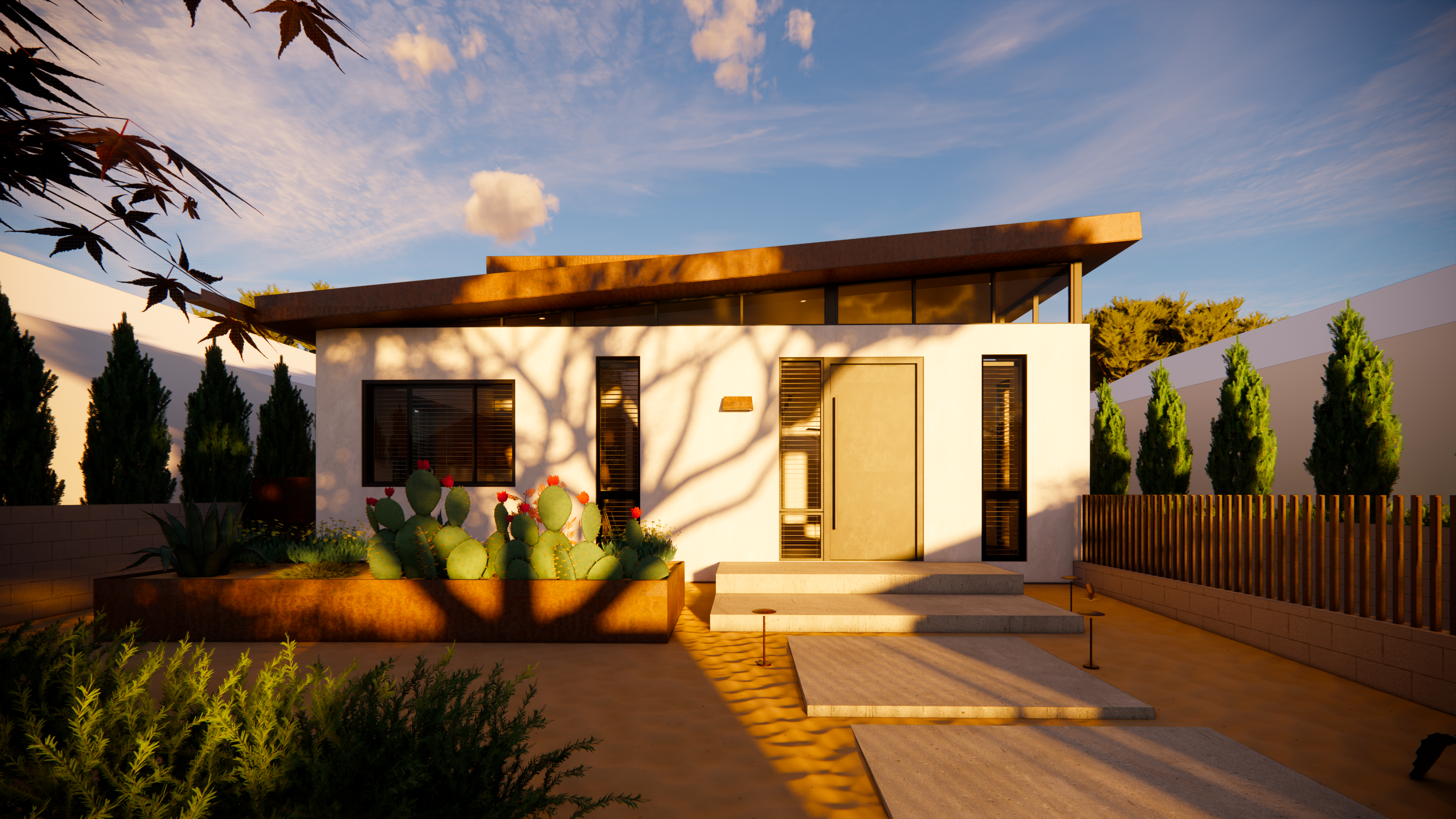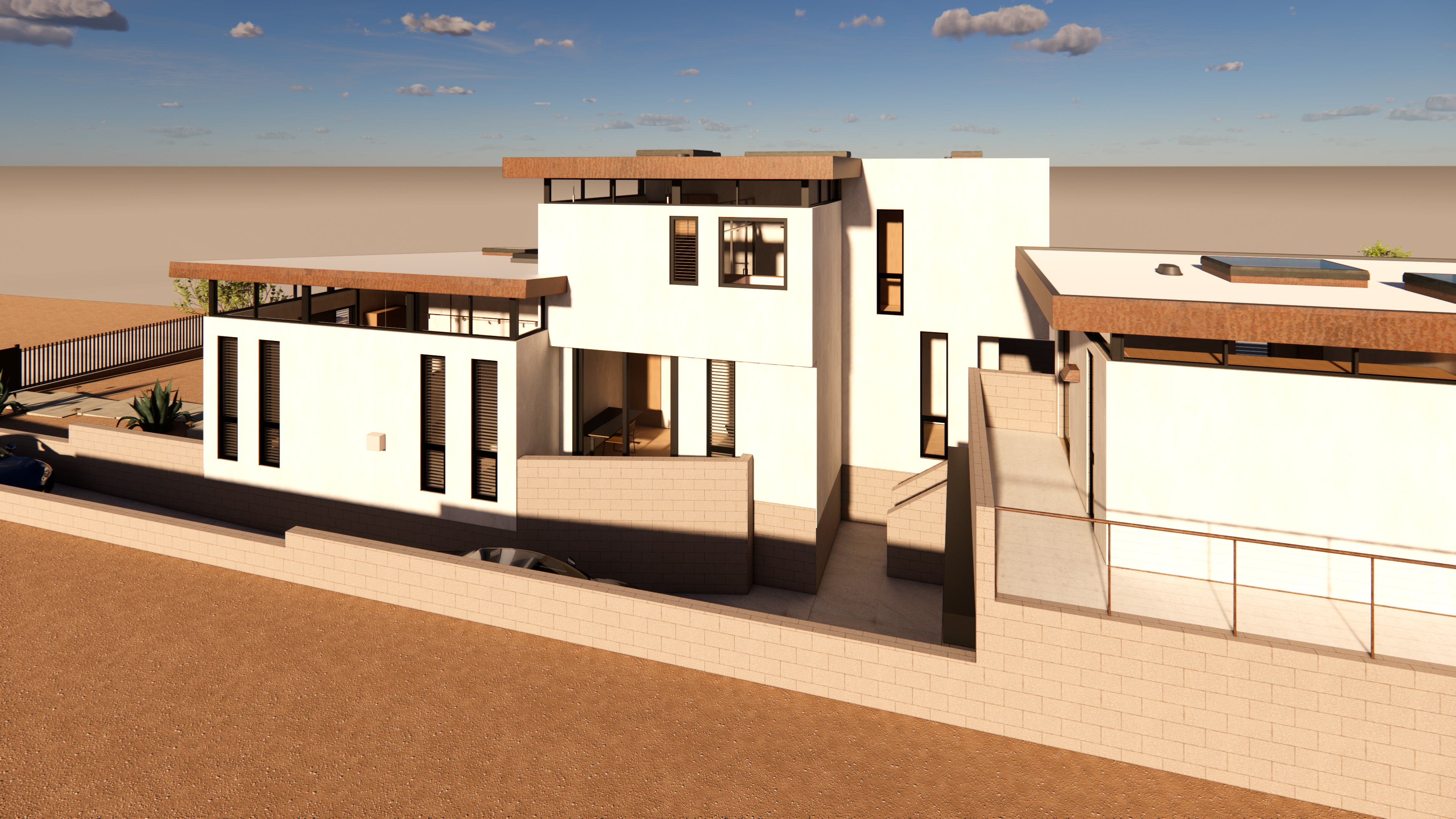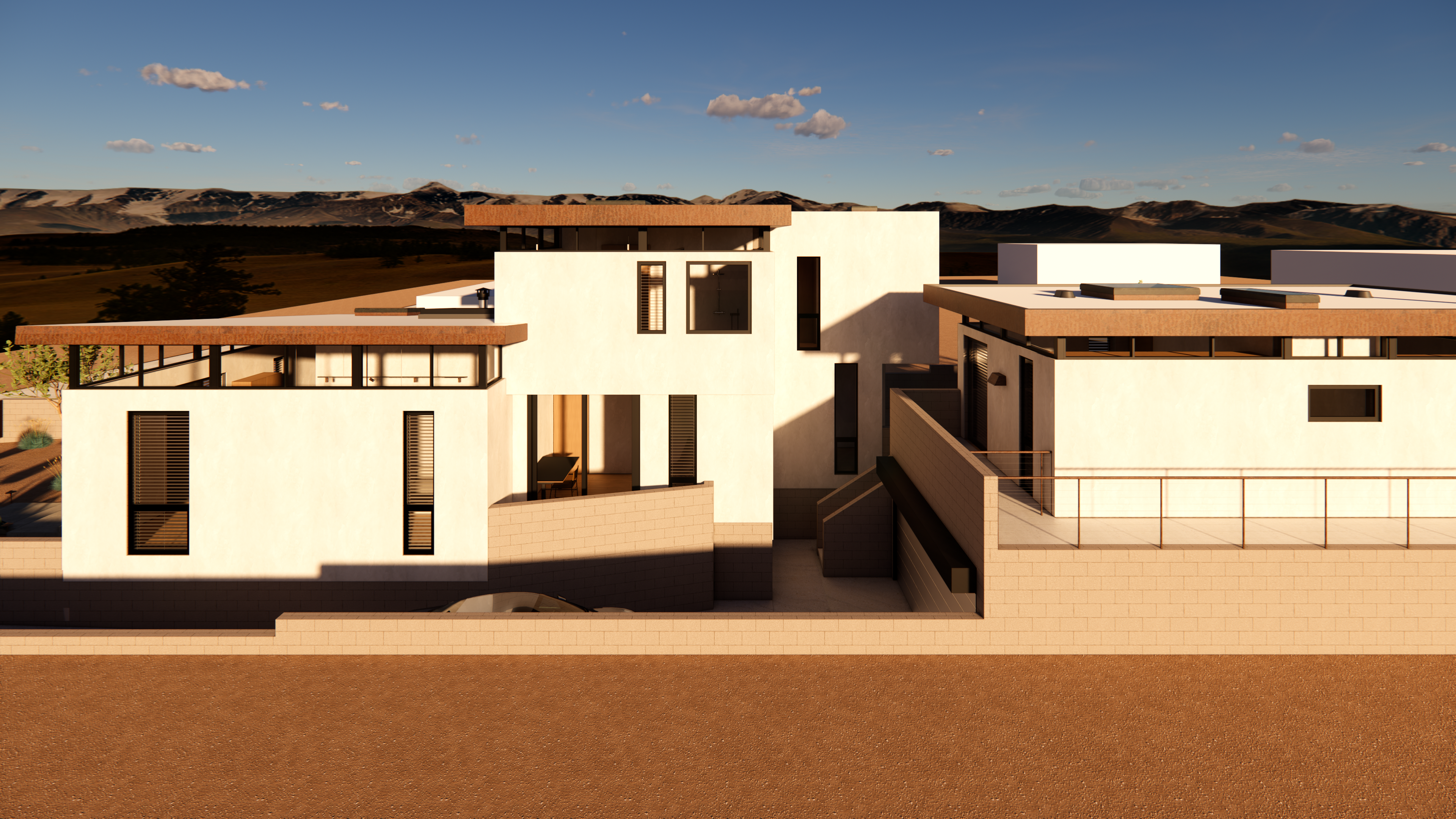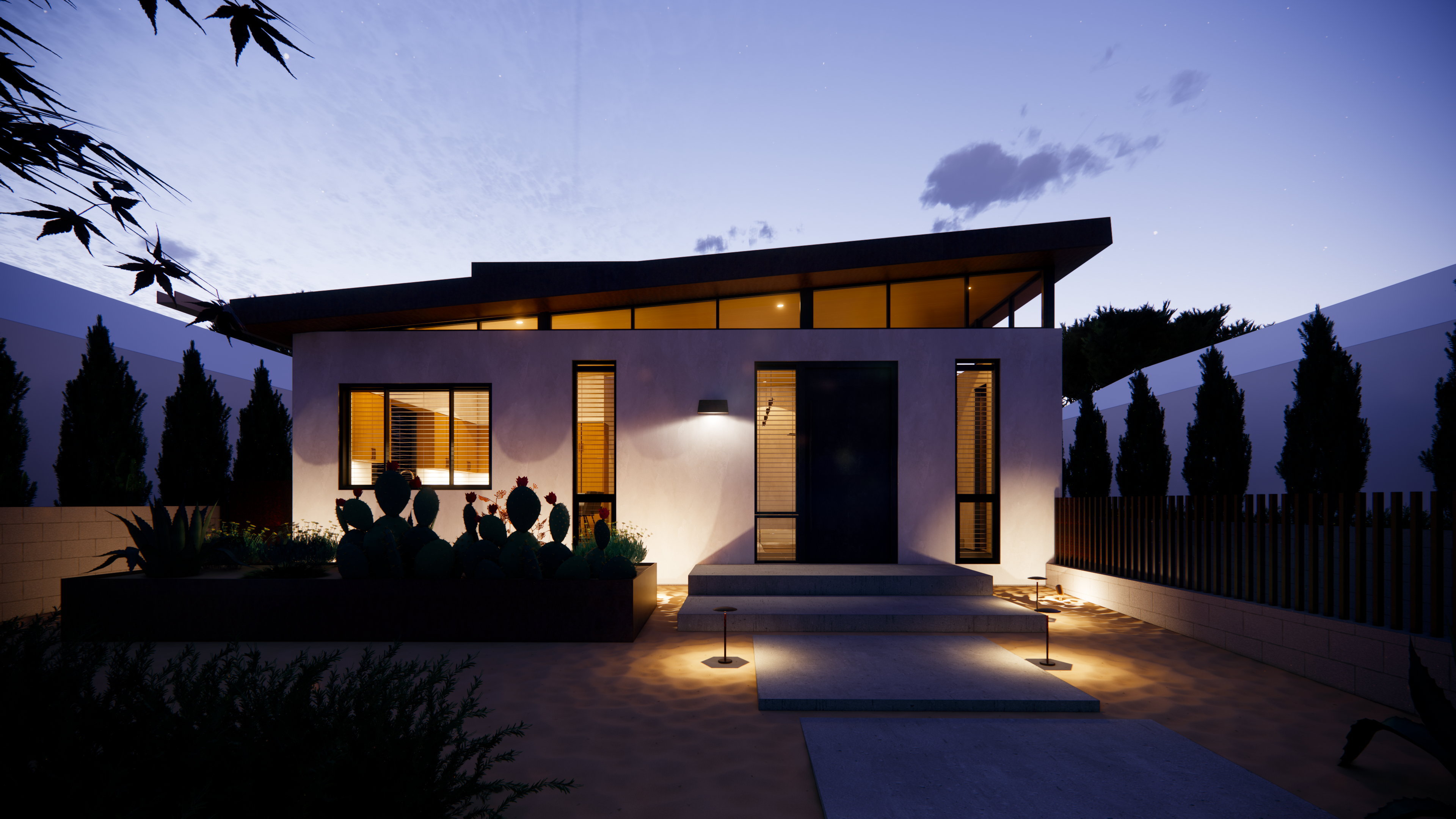 This mid-century inspired project seeks to contribute a new armored, yet comfortable prototype for future construction in the affected area of Pacific Palisades and Altadena. Utilizing the same general footprint of the previous home, this new design offers a strikingly contemporary update, in terms of form and organization, building systems and materials.