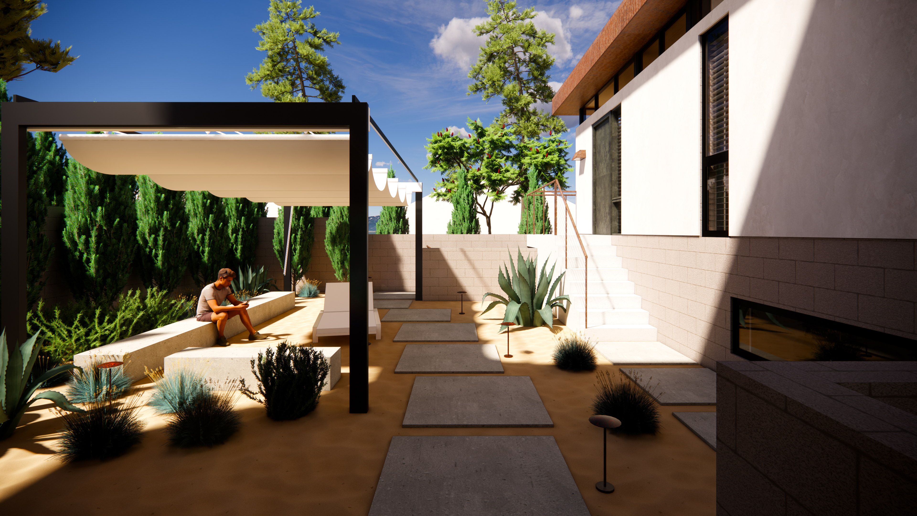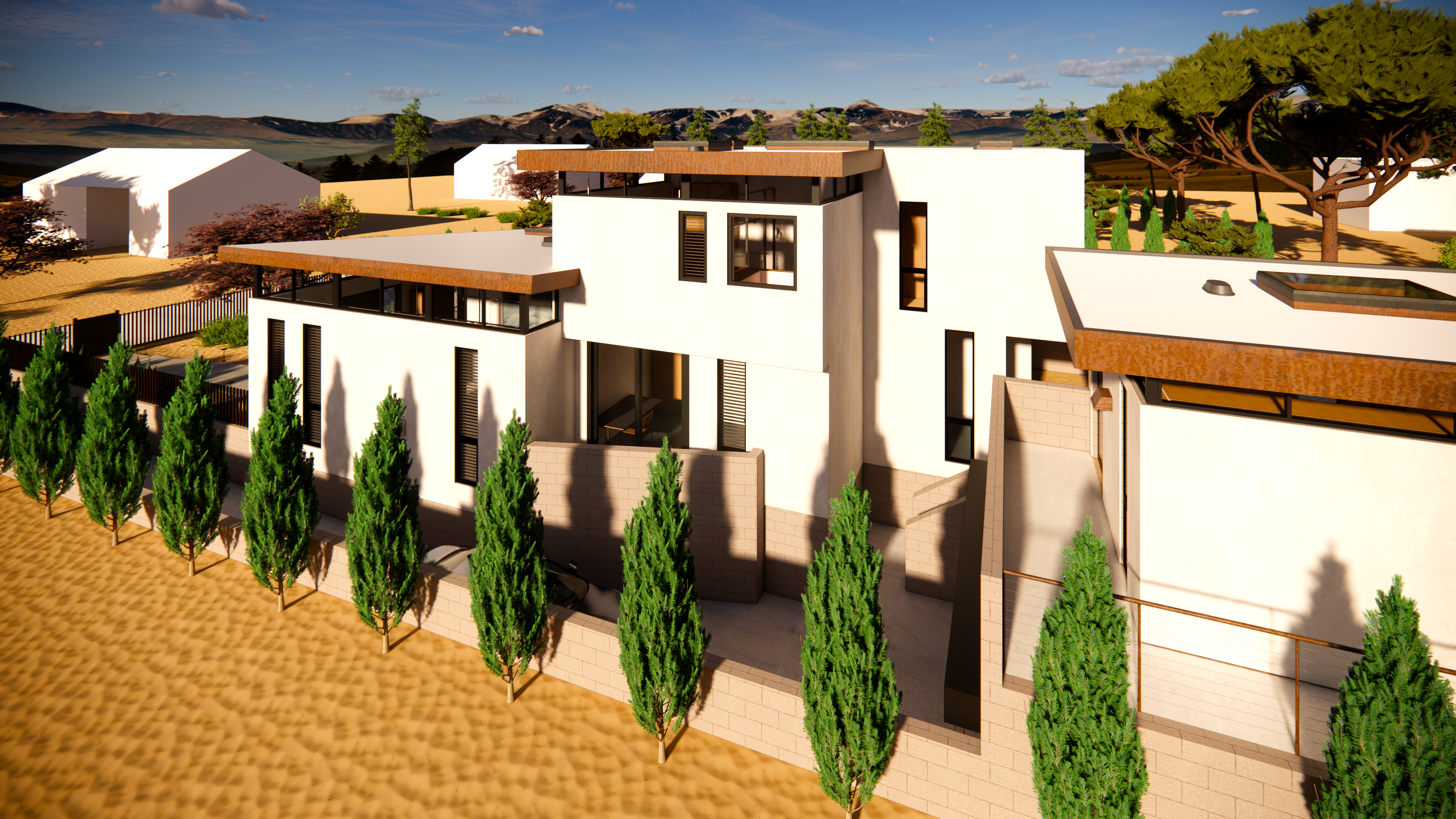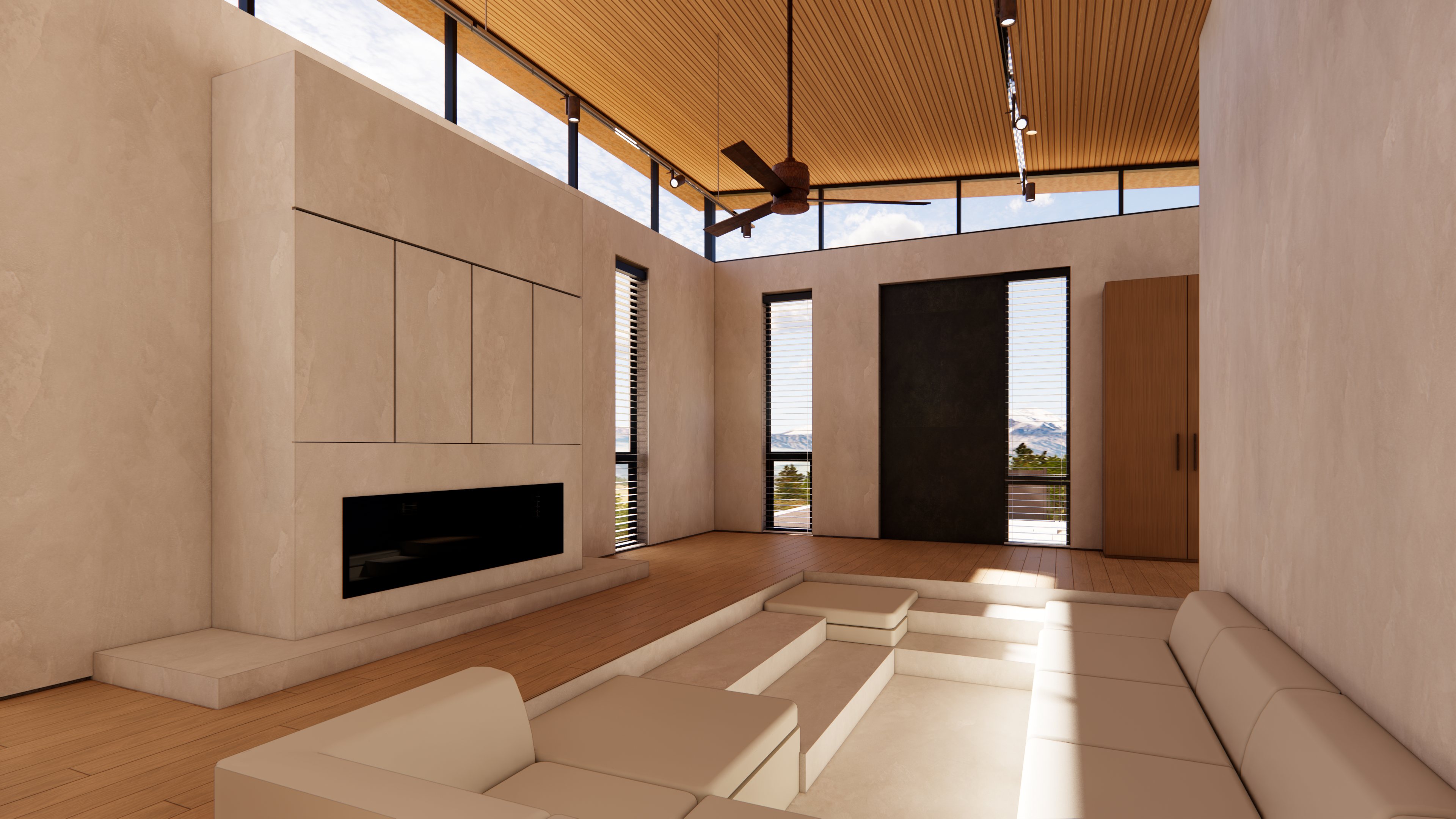 This mid-century inspired project seeks to contribute a new armored, yet comfortable prototype for future construction in the affected area of Pacific Palisades and Altadena. Utilizing the same general footprint of the previous home, this new design offers a strikingly contemporary update, in terms of form and organization, building systems and materials.