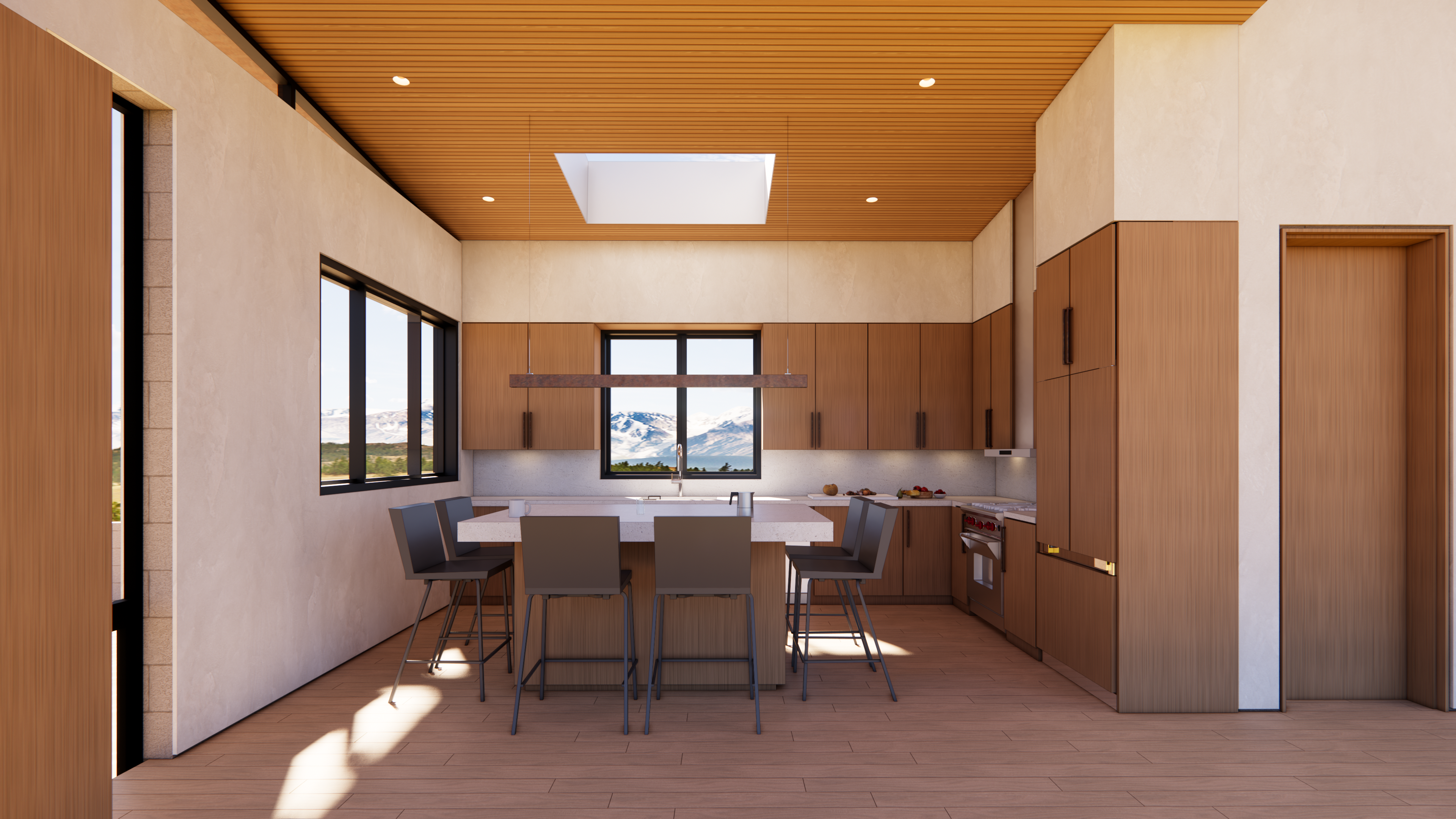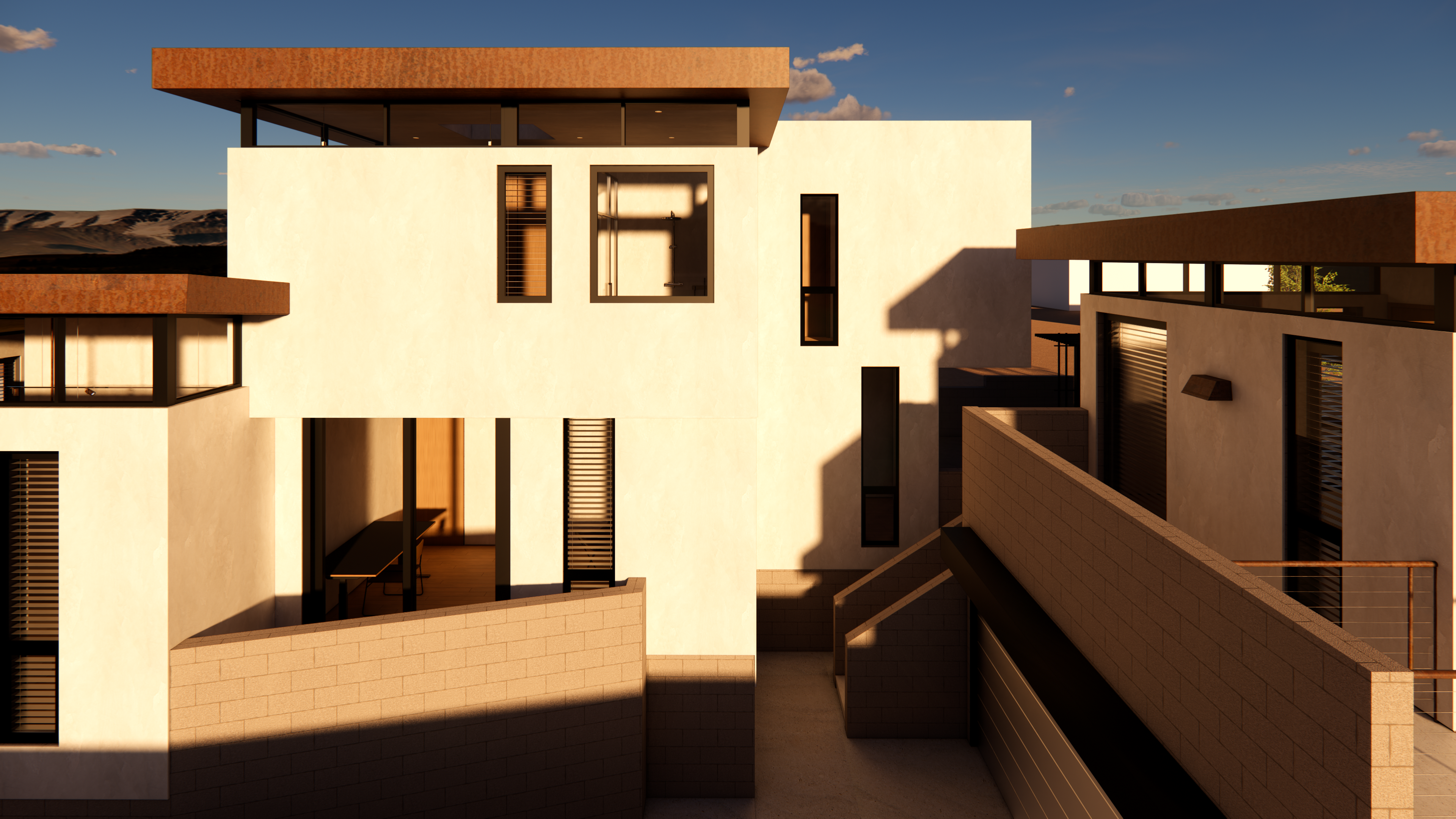Insulated CMU exterior walls, non-combustible plaster, dual glazed and tempered window systems and clerestory, and galvanized steel fascia and soffit detailing form a fire-resistive shell. This new home strives to outlast the next, or any natural disasters that may occur in the years to come.