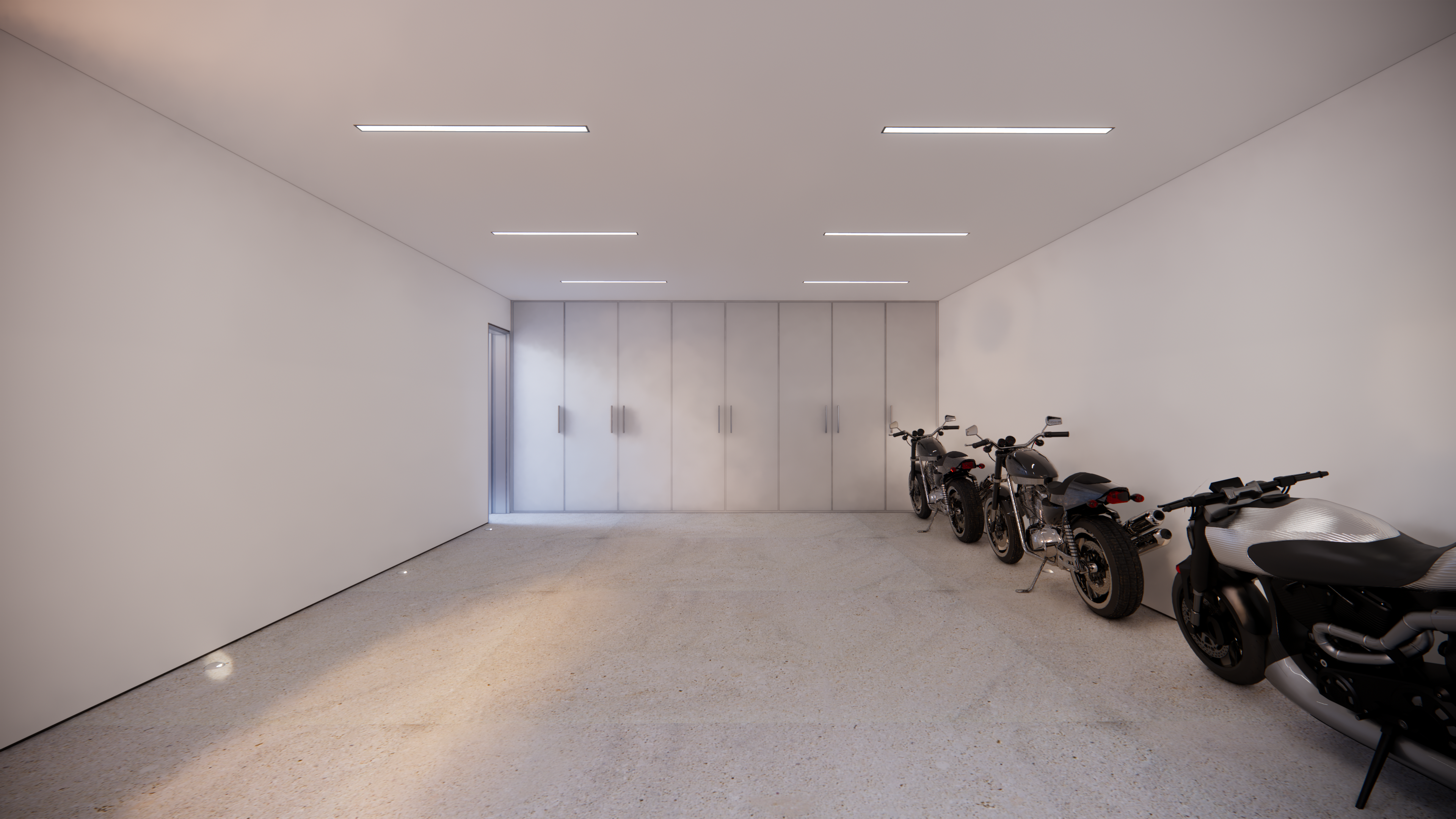 The home features dramatic ambient light provided by continuous clerestory glazing, generously tall interior spaces, a large sunken seated living area, a spaceous kitchen, 3 bedrooms, 2 baths, and a detached ADU above an autere yet bright semi-subterranean 4 car garage which doubles as a mechanic’s studio and motorcycle gallery.